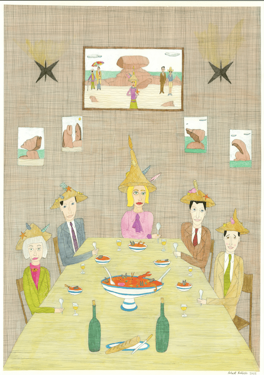 The artist Eileen Agar sits in the cafe with a selection of friends and her older self. All wearing her ceremonial hats for eating Bouillabaisse. The walls of the cafe are artwork depicting the strange stone formation on the Cote de Granite Rose